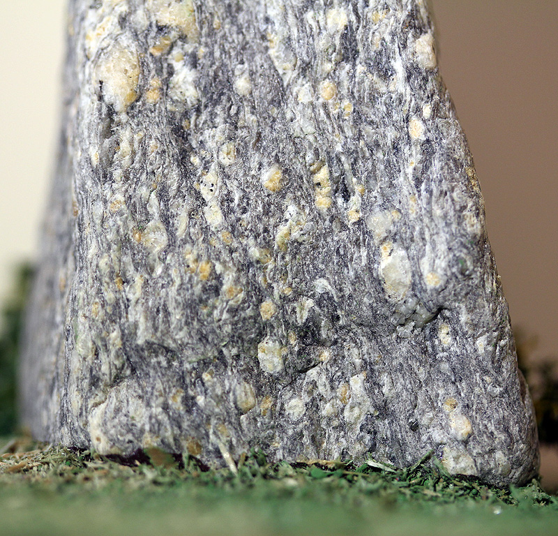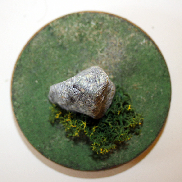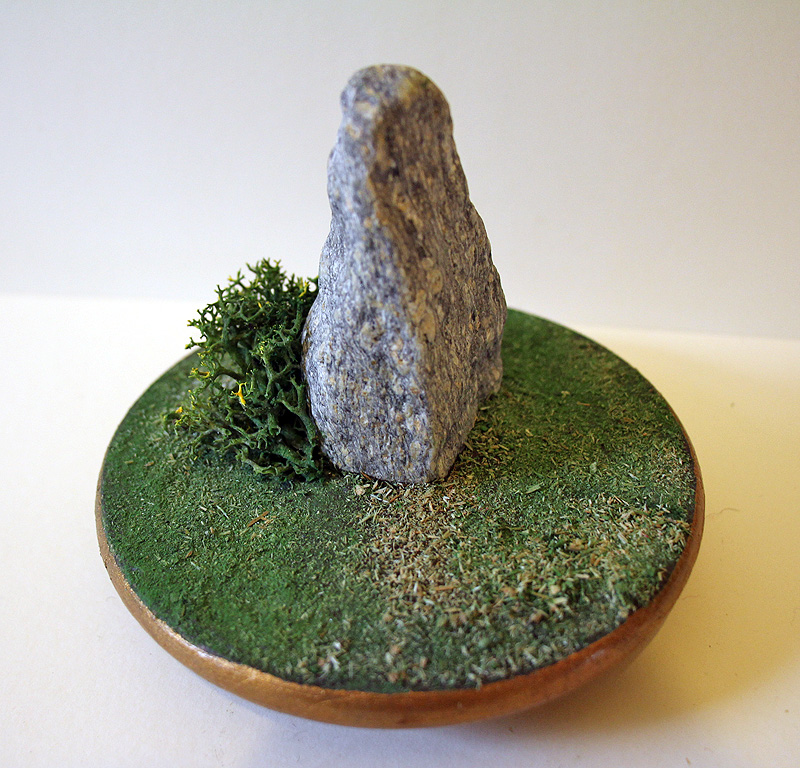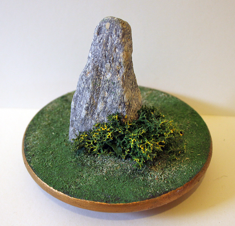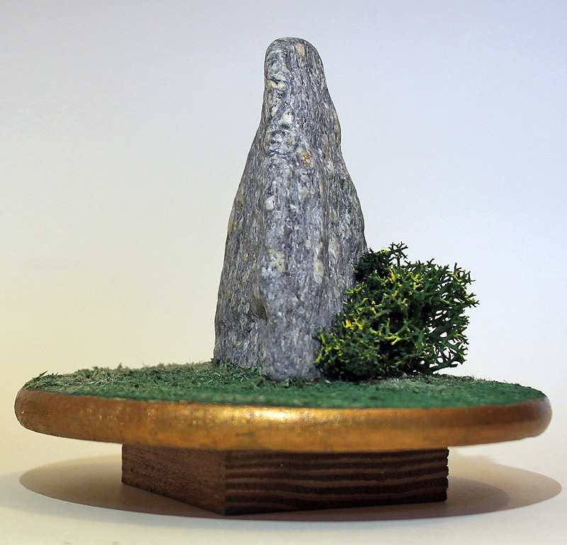 | Premier petit menhir d'une série de 4, avant un moyen, un grand et un autre petit par la suite. J'avais vaguement cela en tête, mais c'est en cherchant autre chose à l'atelier que je suis tombé sur ce caillou, à la base naturellement coupée. J'ai aussitôt pensé à le mettre en scène pour cette phrase, puis j'ai sélectionné les 2 autres pierres. |