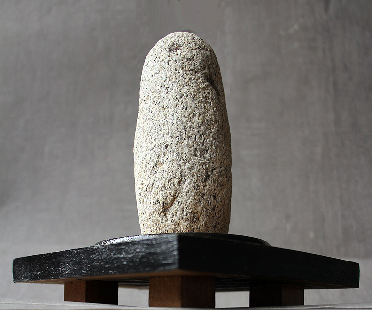 | Deuxème menhir, un peu plus grand que le 1er, et sorti de son milieu naturel pour un artificiel en bois, avec décorations bretonnes. |
