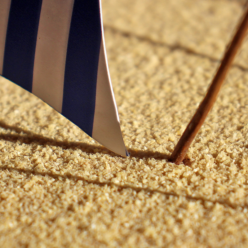 | Les grains de vrai sable eussent été trop gros, et j'ai donc pensé à de la sciure, mais ce n'était pas bon non plus. J'ai alors commandé du sable le plus fin disponible (mais encore trop gros), blanc, puis teinté avec du pigment (ocre jaune) en poudre. Et finalement, j'ai utilisé de la semoule fine, aussi teintée. |
