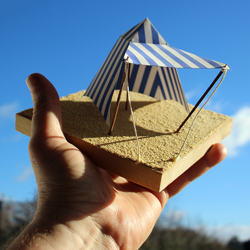 | J'ai fabriqué 3 tentes, car je voulais en faire une œuvre pour la série "Alignements" – ce qui était plus logique –, mais ne fus pas satisfait du rendu... ce qui me navra, car j'y avais passé du temps. Ne voulant pas la détruire, j'ai enfin réalisé cette composition individuelle, gardant les 2 autres en réserve. |