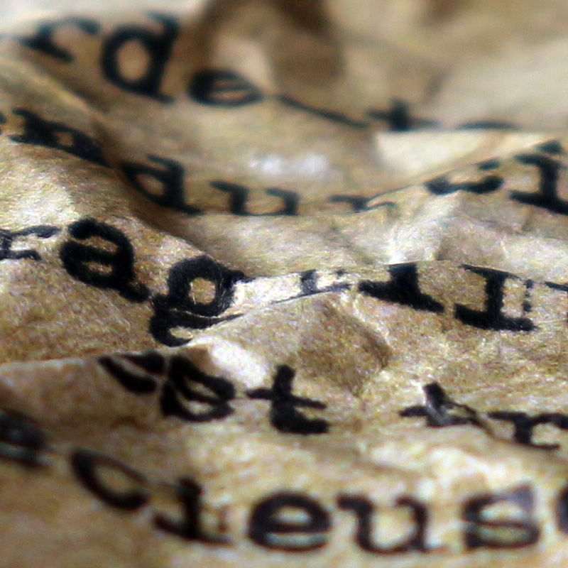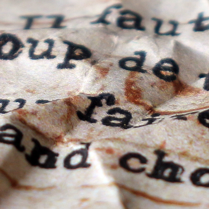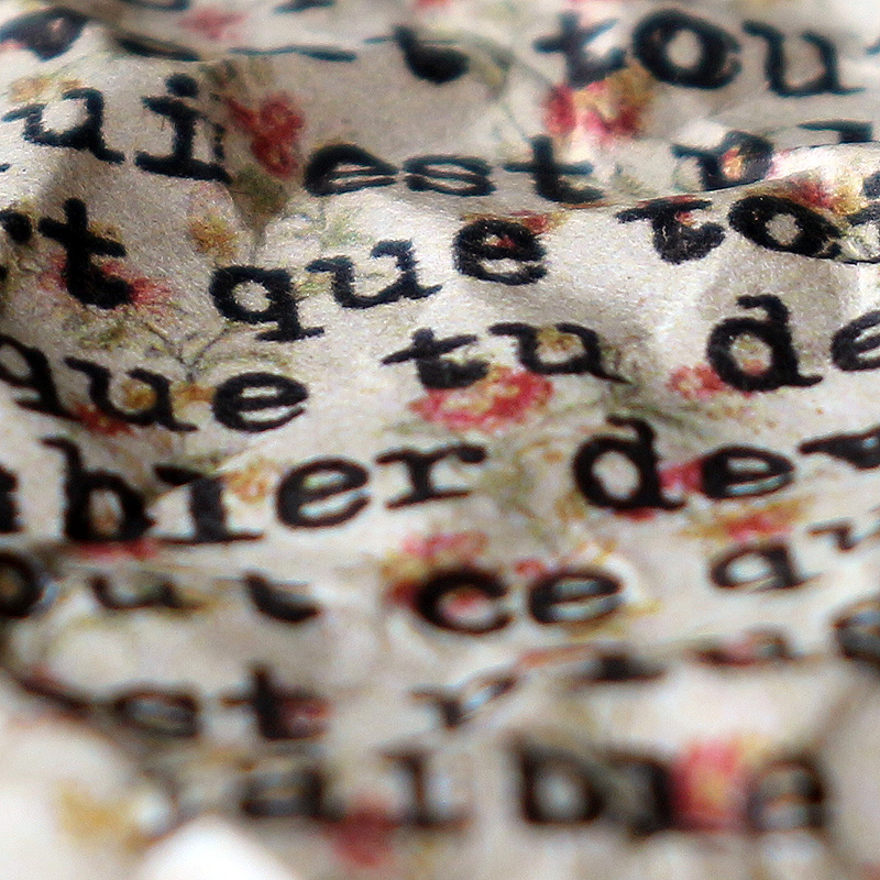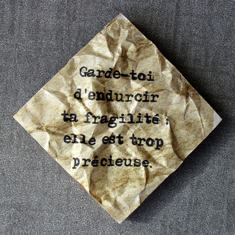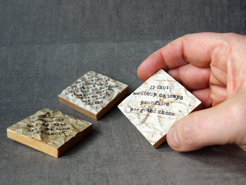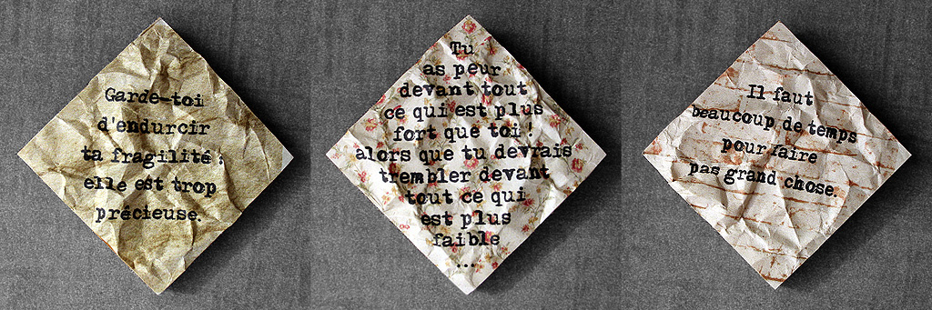 | J'ai déjà employé de mes aphorismes dans des composisitions graphiques, pour les séries « des Choses à Dire » ou « à mots couverts ». J'en reprends ici trois, sur de tous petits supports, en mode froissé, pour ajouter un nouveau rendu à la série Surfaces. J'aime aussi beaucoup le choix de tous petits formats. J'en ferai sûrement d'autres. |
