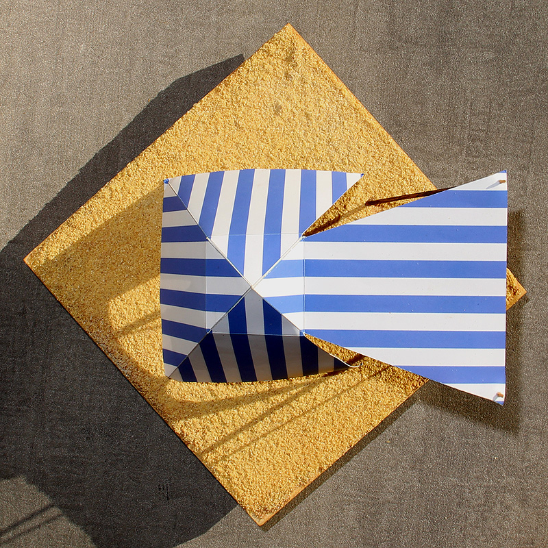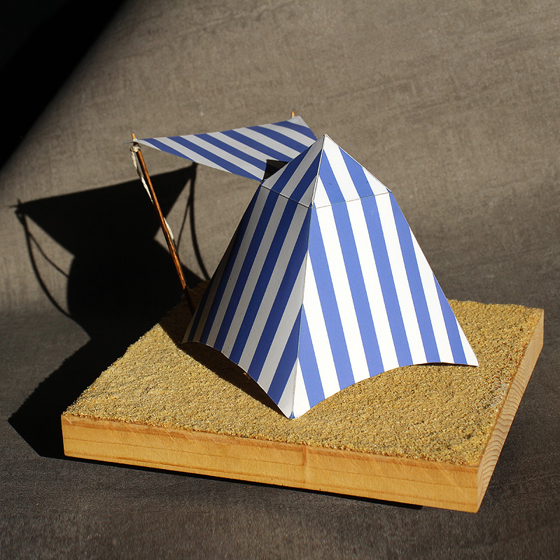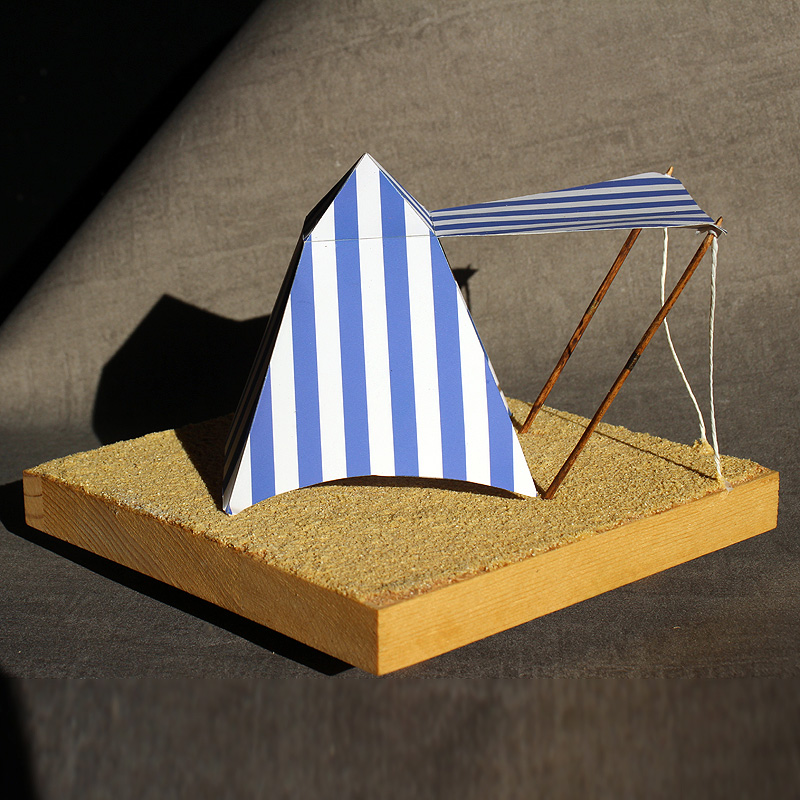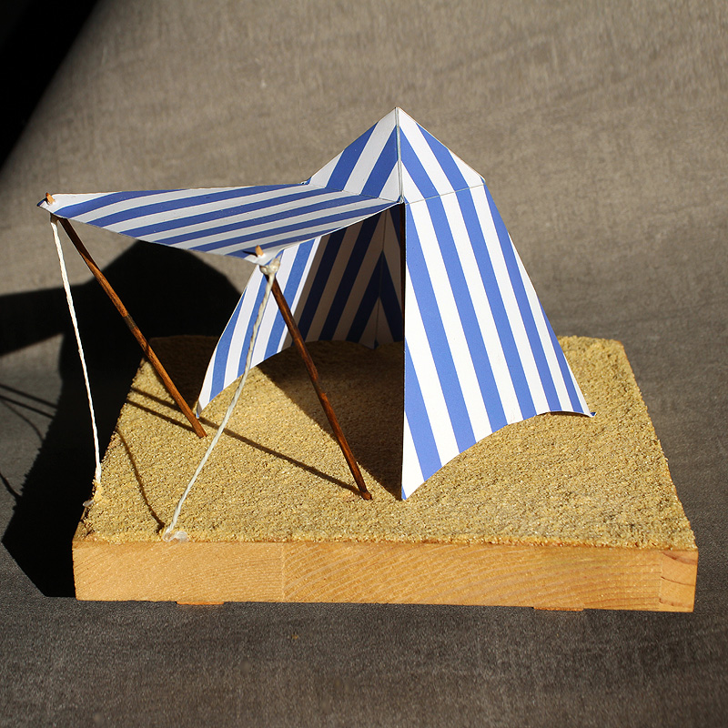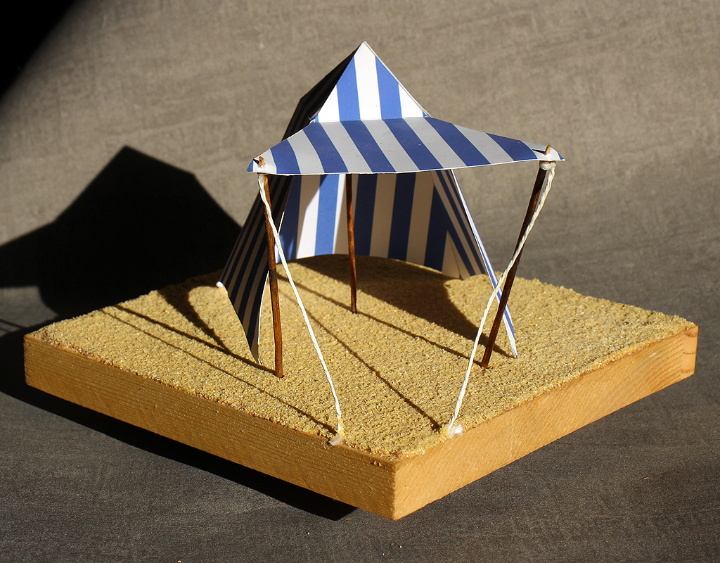| J'ai fabriqué 3 tentes, car je voulais en faire une œuvre pour la série "Alignements" – ce qui était plus logique –, mais ne fus pas satisfait du rendu... ce qui me navra, car j'y avais passé du temps. Ne voulant pas la détruire, j'ai enfin réalisé cette composition individuelle, gardant les 2 autres en réserve. |