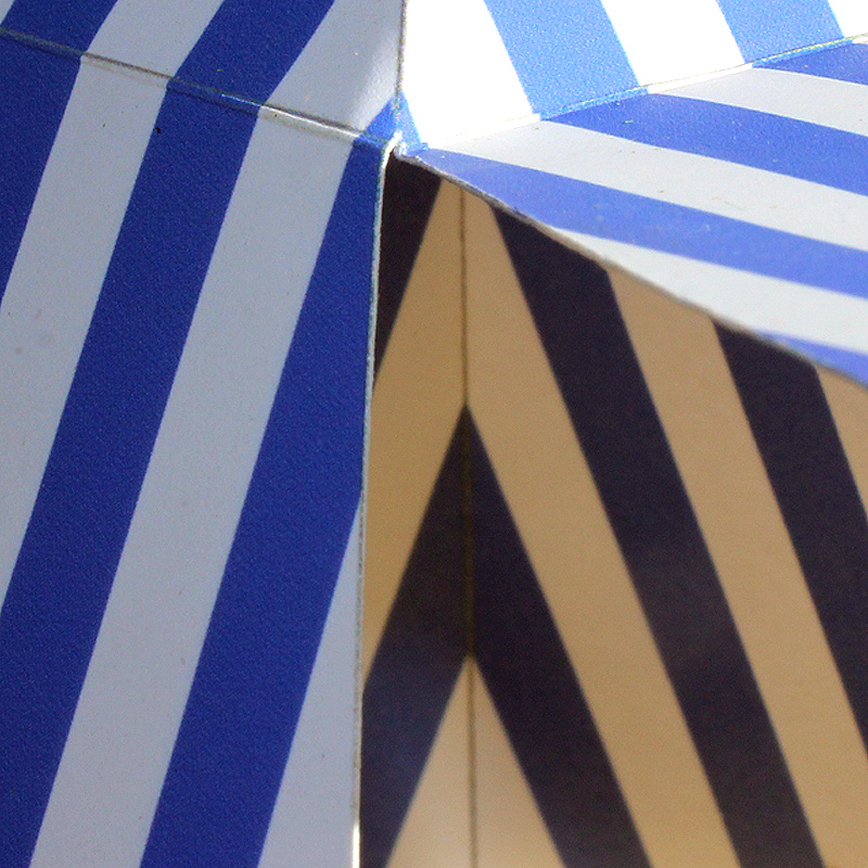 | Les bandes sont deux fois plus larges que les vraies, parce que je suis assez gauche de mes mains et que j'ai supposé que j'aurai trop de mal à peindre des petites... De plus, je les trouve mieux ainsi. Mais hélas, cela n'a pas suffit... Après avoir peint une tente, trop maladroitement pour être validée, je suis passé au marqueur, pour un résultat meilleur, mais toujours pas satisfaisant... J'ai donc alors tout imprimé, la face extérieure en papier couché, et l'intérieure sur de l'ordinaire, mais autocollant. |