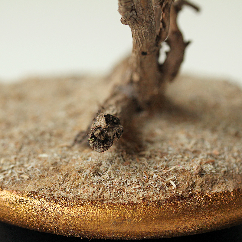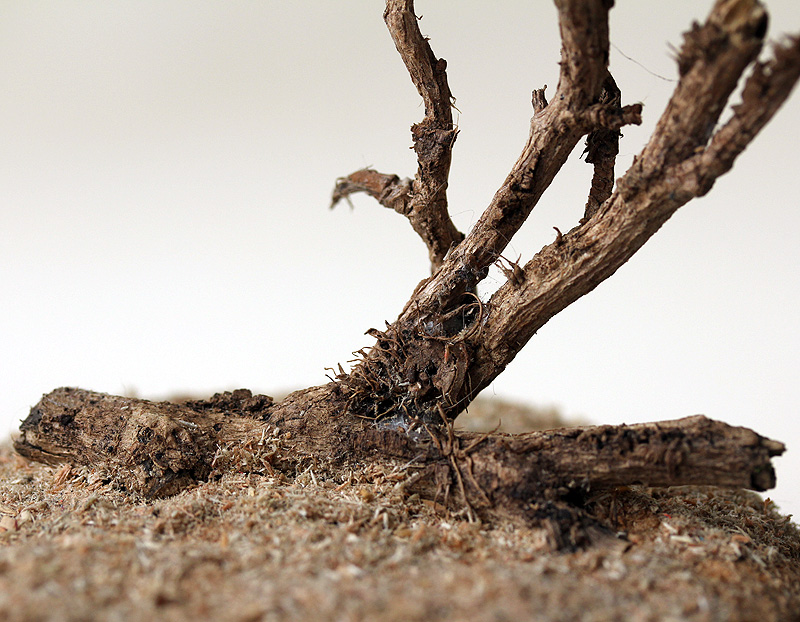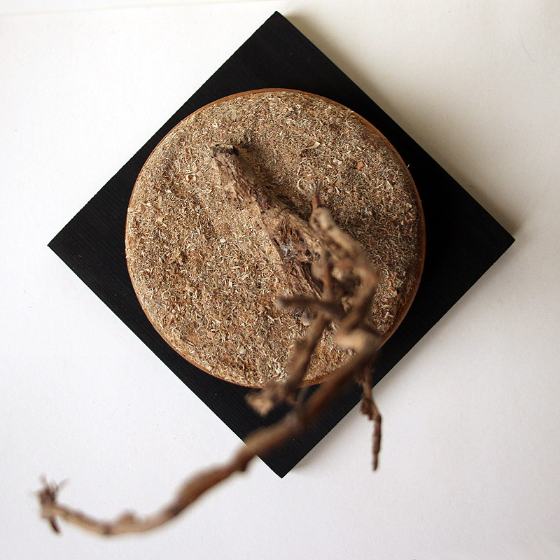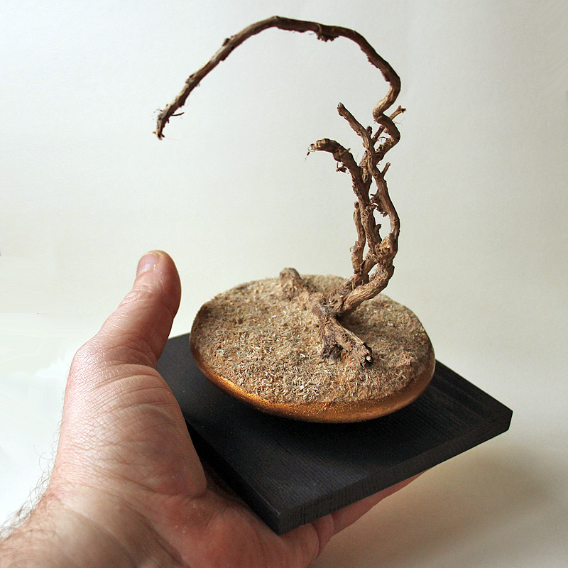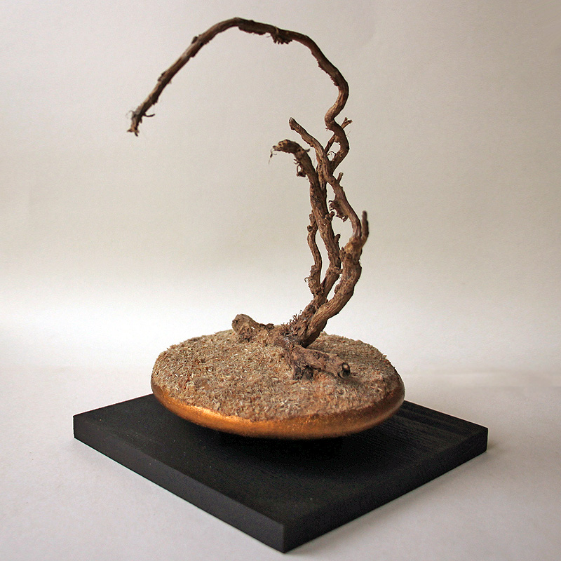 | Micro paysage dans un esprit identique au N°1, de style « Minimaliste naturaliste ». J'y ai mêmement employé des tiges de lierre sec – dont j'aime particulièrement l'aspect torturé. Ambiance plus désertique. |