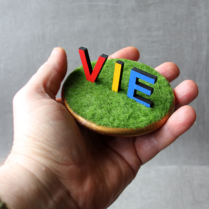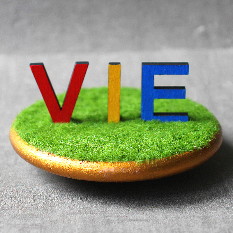 | VIE, aux 3 couleurs primaires, sur un sol vert nature. |