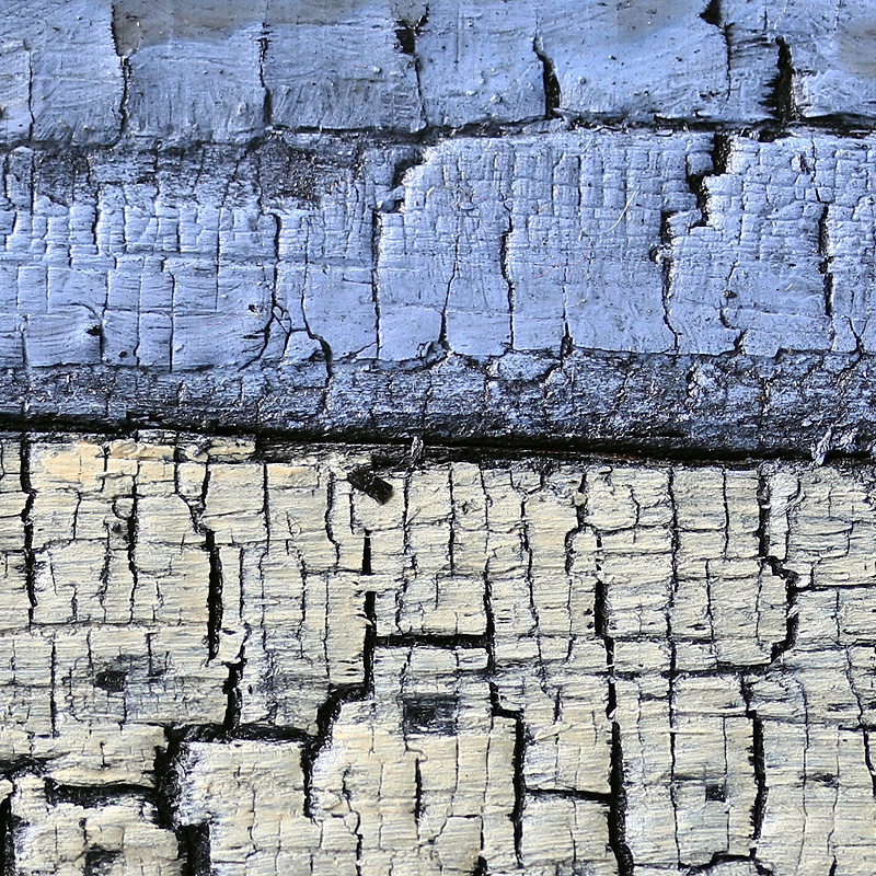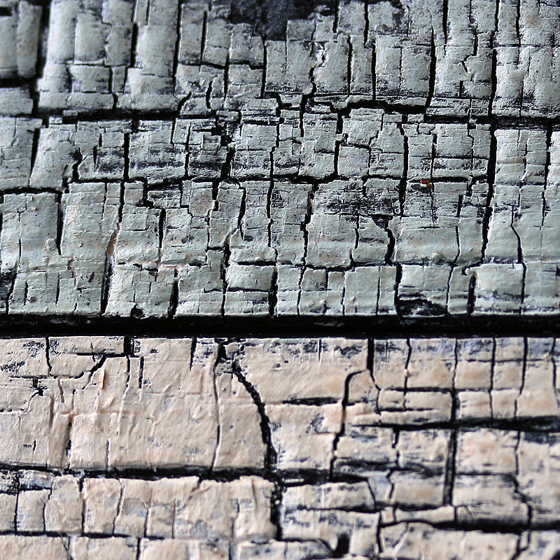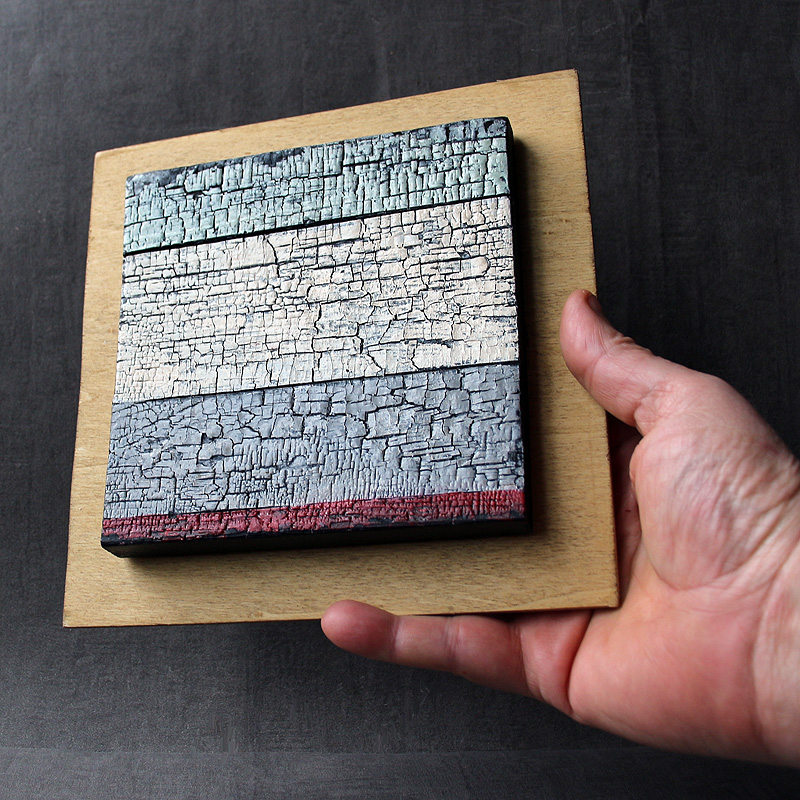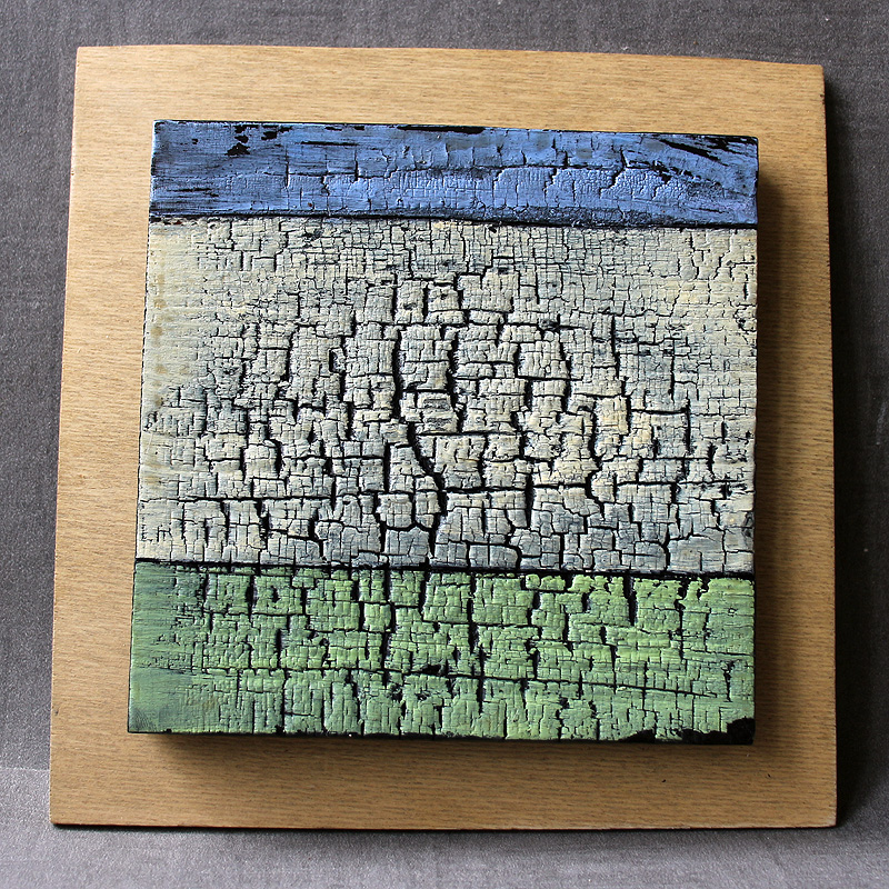 | J'avais déjà pratiqué le bois brûlé (au chalumeau) pour le terrible Labyrinthe 22, en hommage au grand poète juif d'expression allemande, Paul Celan. Le rendu étant esthétiquement intéressant, j'ai pensé réemployer ce procédé pour les Surfaces. J'ai cependant pensé que le simple bois brûlé serait un peu trop austère, et ai donc décidé de le peindre, légèrement, pour mieux mettre en valeur les craquelures. |