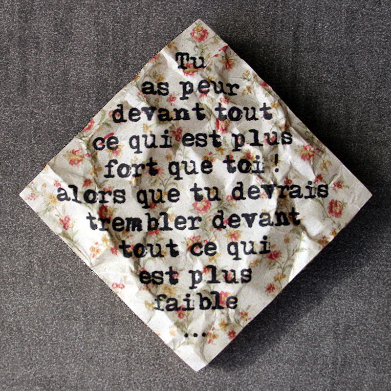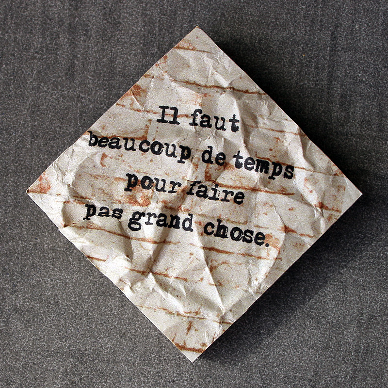 | J'ai déjà employé de mes aphorismes dans des composisitions graphiques, pour les séries « des Choses à Dire » ou « à mots couverts ». J'en reprends ici trois, sur de tous petits supports, en mode froissé, pour ajouter un nouveau rendu à la série Surfaces. J'aime aussi beaucoup le choix de tous petits formats. J'en ferai sûrement d'autres. |