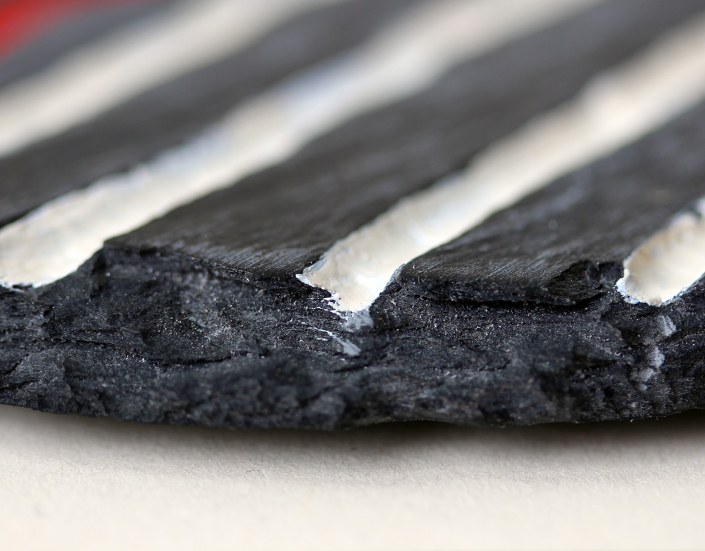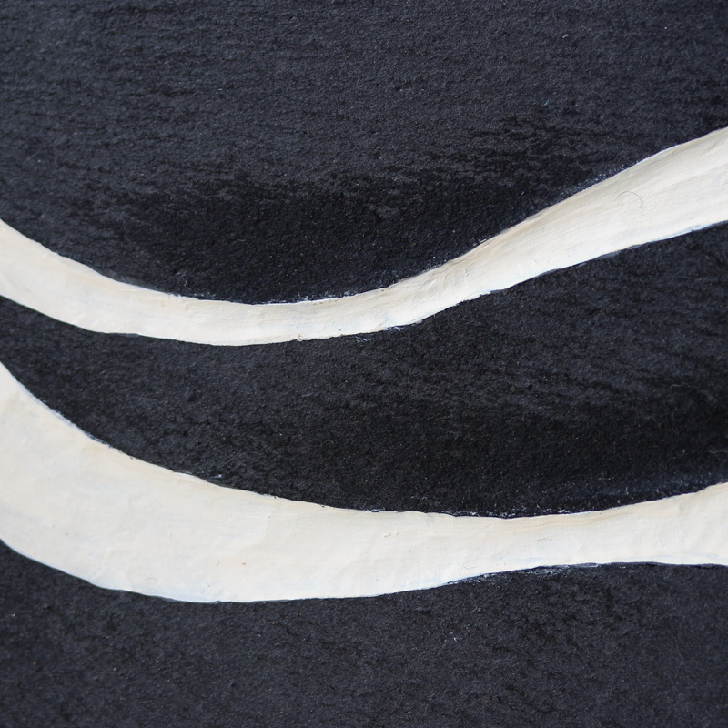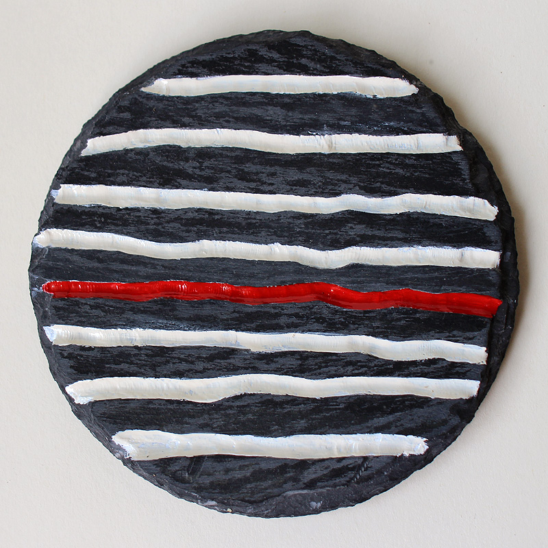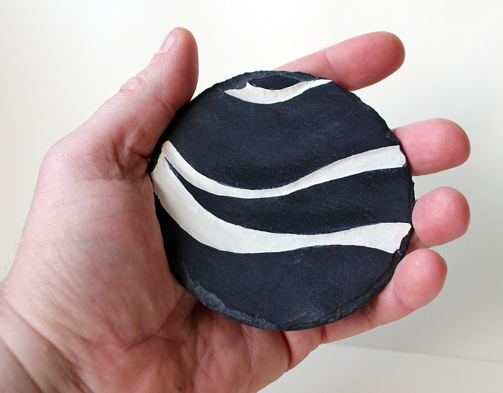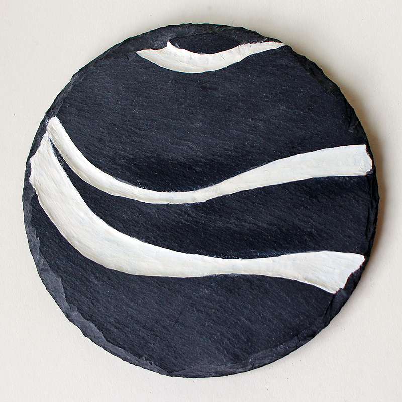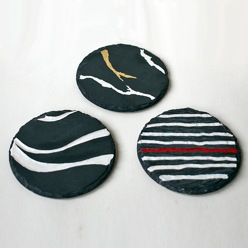 | Voici de l'ardoise, matière chère à ma Bretagne, que je mets en contraste avec une couleur crème, mate ou brillante, rehaussée de rouge ou d'or. Les deux premières sont creusées. |
